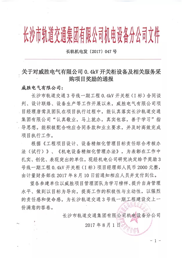 2017年8月1日,威勝電氣還受到長沙市軌道交通集團有限公司獎勵通報,這也是自長沙地鐵開始建設以來,我公司是第一個得到公開獎勵通報的設備廠家。