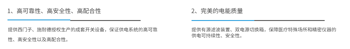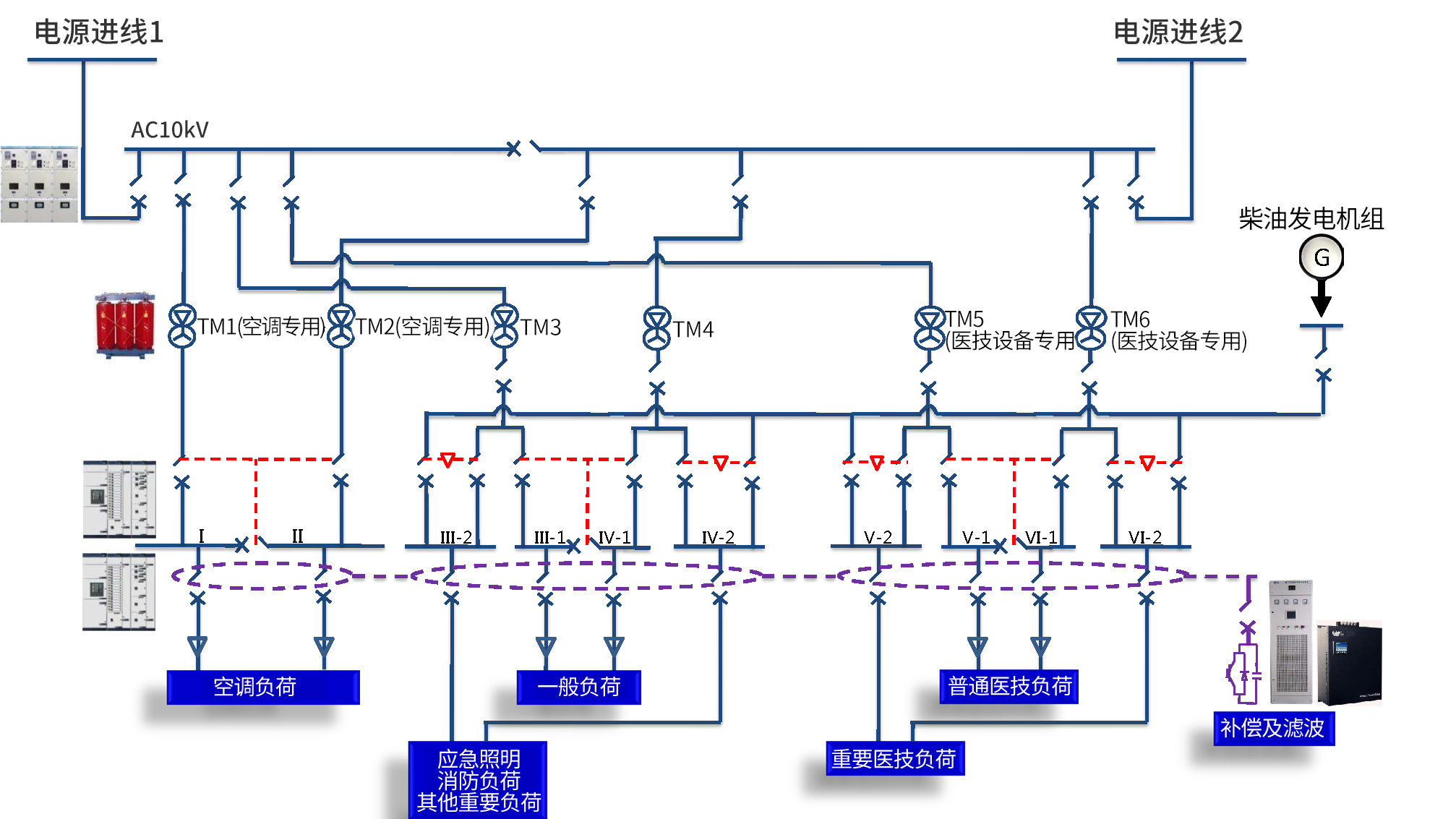 根據(jù)醫(yī)院配電系統(tǒng)的特殊性,我司設(shè)計(jì)了高可靠性、高安全性的配電系統(tǒng)。中低壓配電開關(guān)柜可選用施耐德或西門子授權(quán)柜;特殊醫(yī)療場(chǎng)所,如手術(shù)區(qū)等,可選用高可靠性的雙電源切換箱;針對(duì)精密醫(yī)療設(shè)備,對(duì)電能質(zhì)量要求特別高的場(chǎng)合,可選用具有完美濾波功能的壁掛式有源濾波裝置,節(jié)省占用空間,也方便后期改造擴(kuò)容。