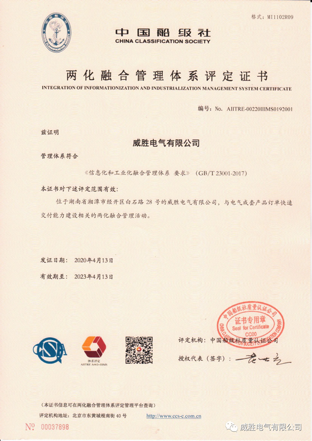 經(jīng)過中國船級社專家來司評估現(xiàn)場審核工作,最終威勝電氣順利通過兩化融合體系評估認證。并于2020年4月13日收到國家工信部簽發(fā)的兩化融合管理體系評定證書。