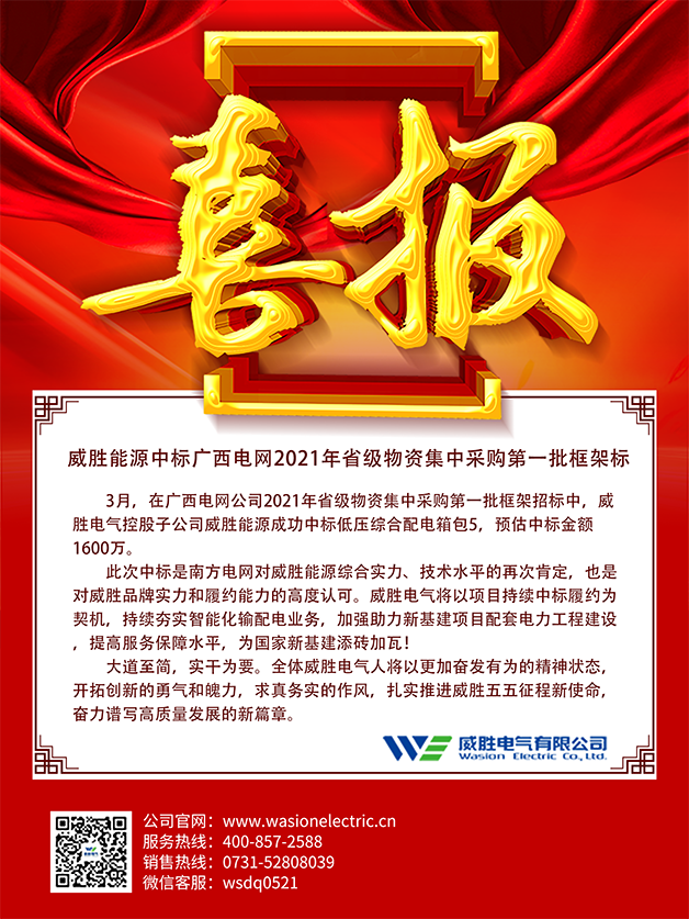 3月,在廣西電網公司2021年省級物資集中采購第一批框架招標中,威勝電氣控股子公司惟遠能源成功中標低壓綜合配電箱包5,預估中標金額1600萬。