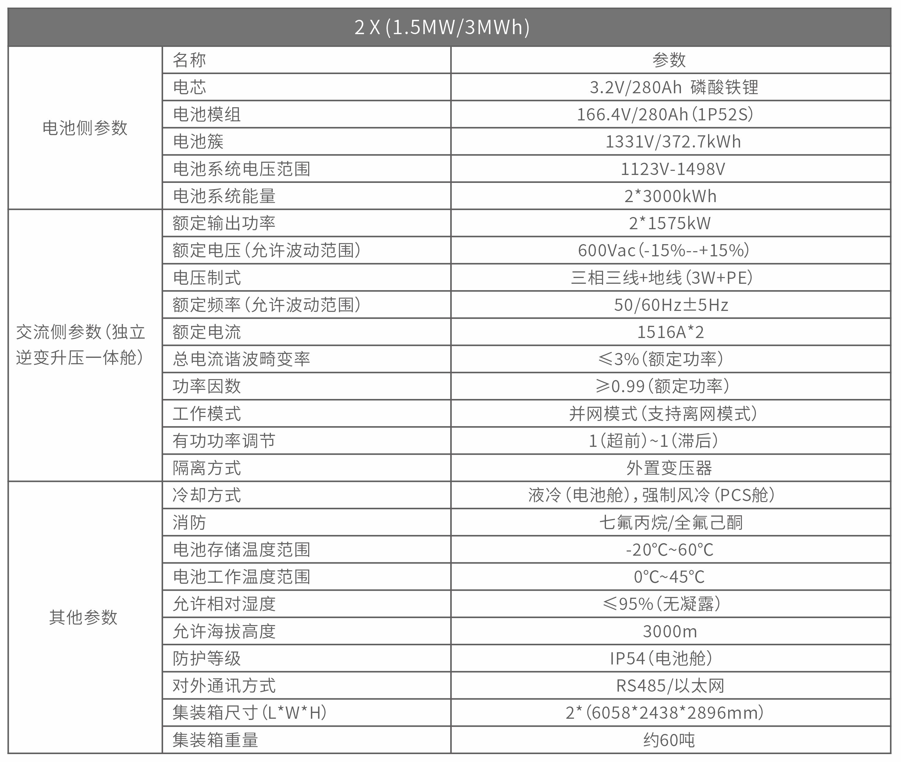 電池架與集裝箱一體,長度為6米,強度高,無需特制吊具,解決電吊裝運輸時集裝箱變形問題。倉內預留一簇電池位,如滿裝單機容量可達3357kWh, 或安裝一臺250kW逆變器,滿足用戶側使用場景的需求。