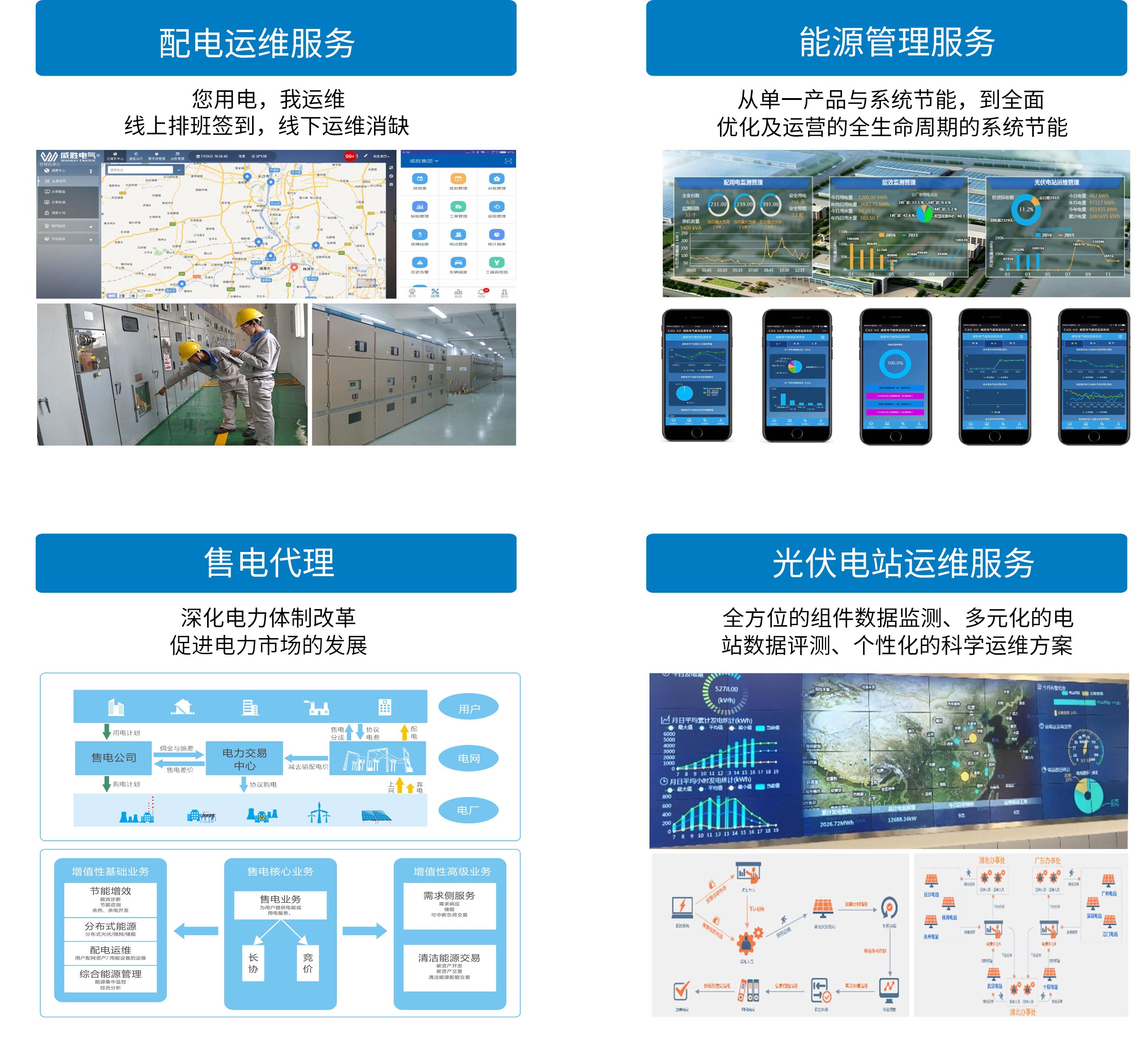 綜合能源服務(wù)解決方案是針對(duì)智能化配電運(yùn)維服務(wù)及能源(節(jié)能)管理、售電代理、光伏電站運(yùn)維服務(wù)等業(yè)務(wù)提供一站式的智能化能源綜合服務(wù)方案。