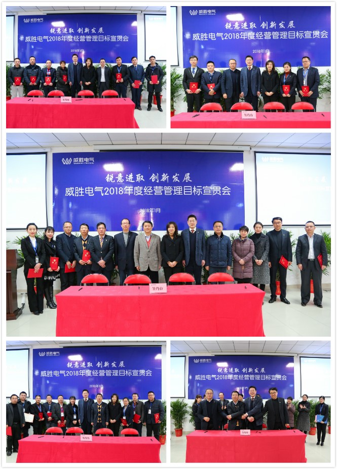 會議第二階段舉行電氣2018年經(jīng)營管理目標簽字儀式:首先,電氣董事長曹總鄭重向控股董事會吉主席簽署2018年目標承諾書;隨后,威勝電氣總裁曾辛先生向電氣董事長曹總簽署2018年目標承諾書;接著,由電氣經(jīng)營管理團隊責任人、銷售負責人簽2018年目標承諾書。